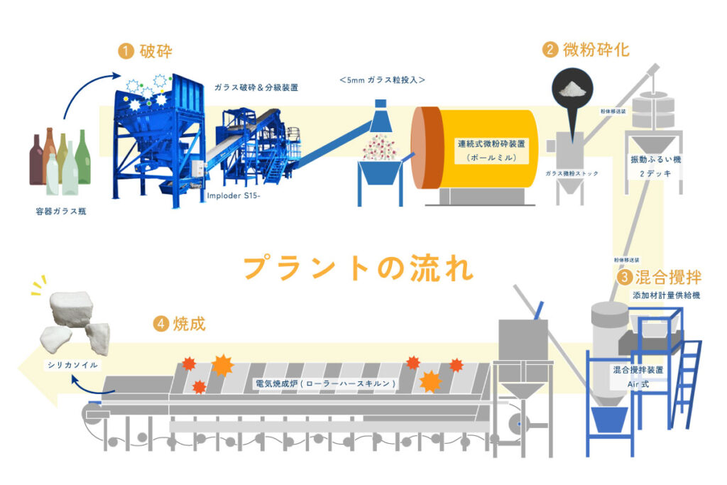 集めた廃ガラスは、ホッパーに投入された後、破砕分級装置に送られ直径5mm以下のガラス粒に仕上げられます。5mm以下のガラス粒はコンクリートの骨材など、砂の代用品として使うことができます。